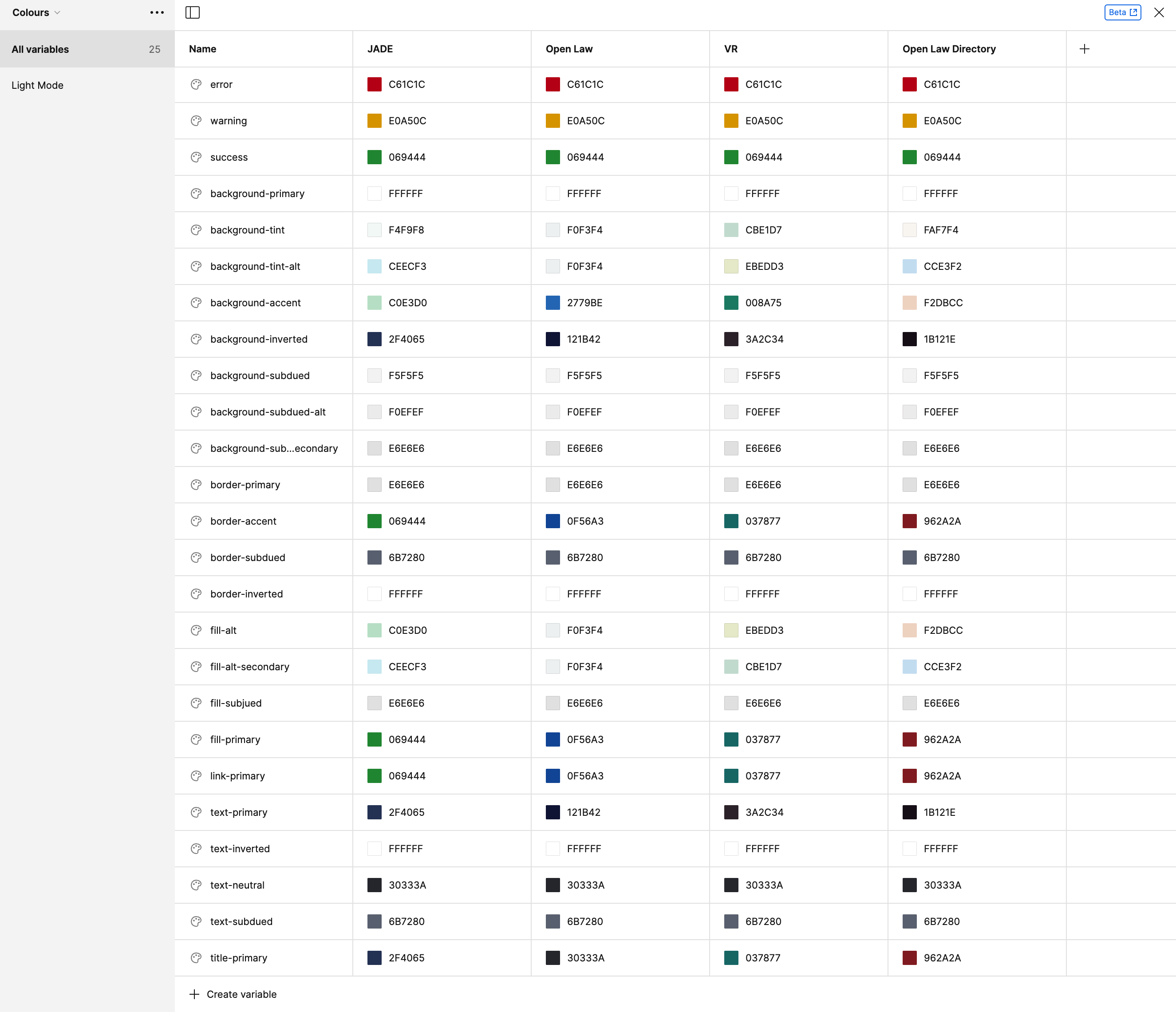 - Accessibility – colour variables labelled semantically in Figma makes it easier to have consistently WCAG AA-compliant colour combinations.